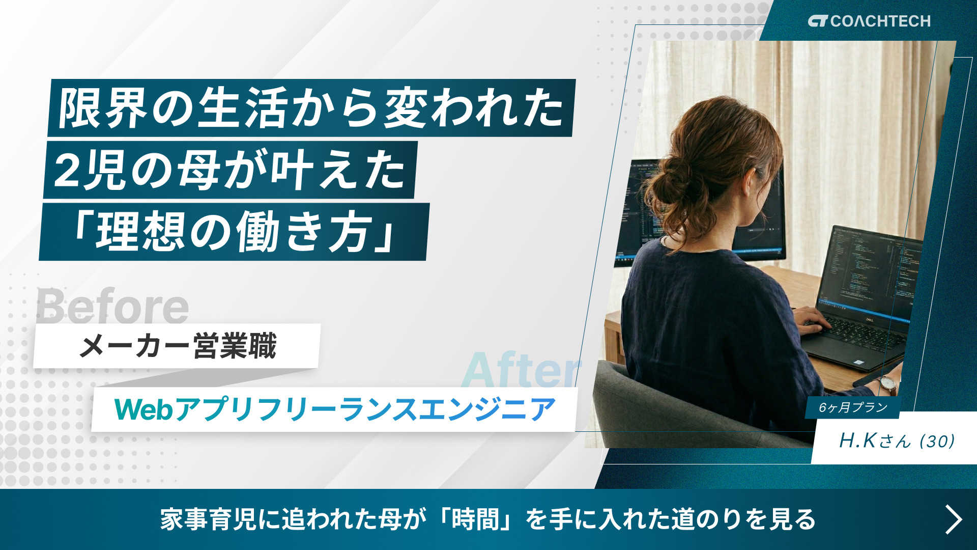 経歴:食品調味料メーカーの営業職として7年間勤務。夫の転勤を機に退職し、在宅で働けるエンジニアを目指してコーチテックを受講。現在は2人のお子さん(4歳と1歳)を育てながら、フリーランスのWebアプリケーションエンジニアとして活躍中。